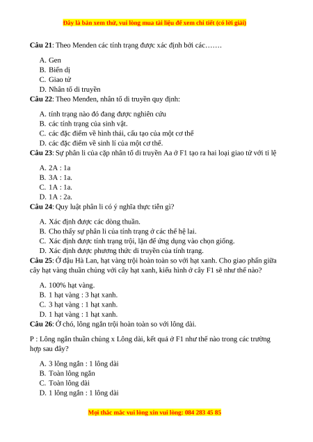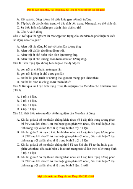 Câu 7: Kết quả thí nghiệm lai một cặp tính trạng của Menđen đã phát hiện ra kiểu tác động nào của gen?