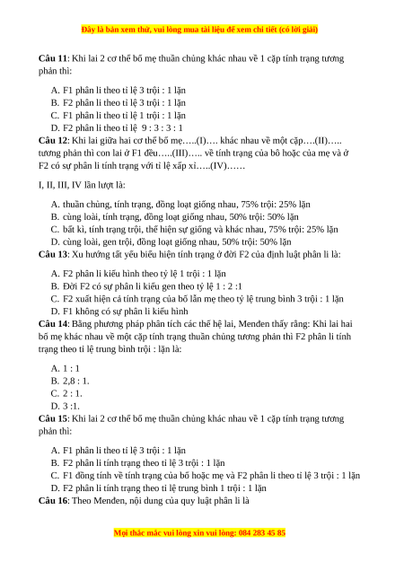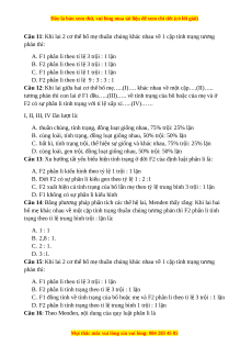 Câu 14: Bằng phương pháp phân tích các thế hệ lai, Menđen thấy rằng: Khi lai hai