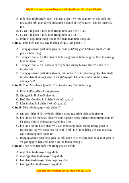 Câu 17: Phát biểu nào sau đây là đúng về quy luật phân li ?