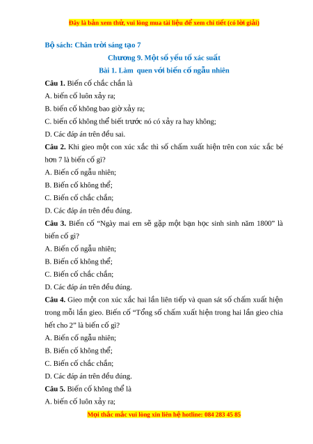 Đây là bản xem th , vu ử i lòng mua tài li u ệ đ xe ể m chi ti t ế (có l i ờ gi i ả ) Bộ sách: Chân tr i ờ sáng t o 7 ạ Chư ng 9. M ơ t ộ s y ố u t ế xác s ố u t ấ Bài 1. Làm quen v i ớ bi n c ế ng ố u nhi ẫ ên Câu 1. Bi n c ế ố ch c ắ ch n ắ là A. bi n c ế ố luôn x y r ả a; B. bi n c ế ố không bao gi x ờ y ả ra; C. bi n c ế ố không th bi ể t ế trư c nó có x ớ y ả ra hay không; D. Các đáp án trên đ u s ề ai. Câu 2. Khi gieo m t ộ con xúc x c ắ thì số ch m ấ xu t ấ hi n ệ trên con xúc x c ắ bé h n 7 l ơ à bi n c ế ố gì? A. Bi n c ế ố ngẫu nhiên; B. Bi n ế cố không th ; ể C. Bi n ế cố ch c ch ắ n; ắ