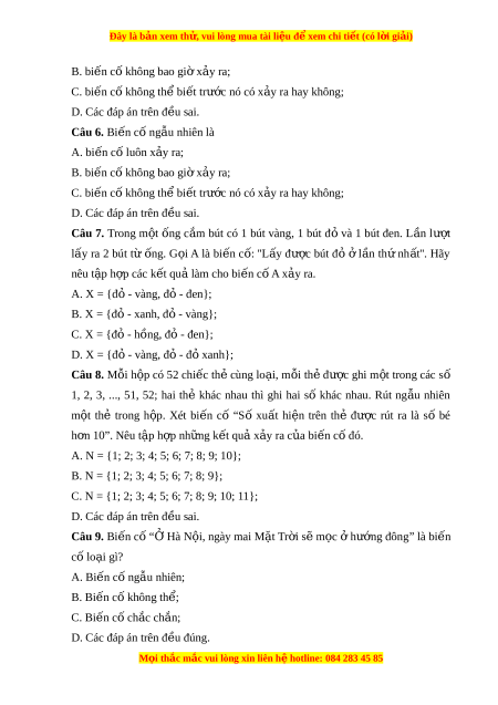 Đây là bản xem th , vu ử i lòng mua tài li u ệ đ xe ể m chi ti t ế (có l i ờ gi i ả ) B. bi n c ế ố không bao gi x ờ y ả ra; C. bi n c ế ố không th bi ể t ế trư c nó có x ớ y ả ra hay không; D. Các đáp án trên đ u s ề ai. Câu 6. Bi n c ế ố ngẫu nhiên là A. bi n c ế ố luôn x y r ả a; B. bi n c ế ố không bao gi x ờ y ả ra; C. bi n c ế ố không th bi ể t ế trư c nó có x ớ y ả ra hay không; D. Các đáp án trên đ u s ề ai. Câu 7. Trong m t ộ ng ố c m