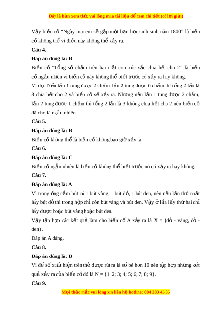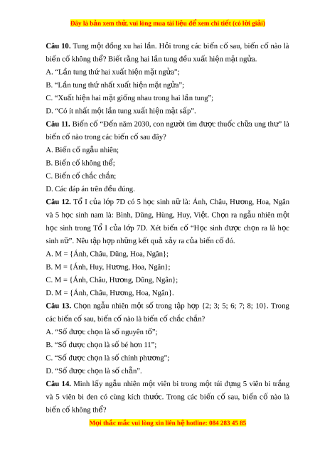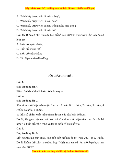 Đây là bản xem th , vu ử i lòng mua tài li u ệ đ xe ể m chi ti t ế (có l i ờ gi i ả ) A. “Minh lấy đư c ợ viên bi màu tr ng”; ắ B. “Minh lấy đư c vi ợ ên bi màu đen”; C. “Minh lấy đư c vi ợ ên bi màu tr ng ho ắ c ặ màu đen”; D. “Minh lấy đư c ợ viên bi màu đ ”. ỏ Câu 15. Bi n ế cố “Có sáu c n ơ bão đ ổ b ộ vào nư c ớ ta trong năm t i ớ ” là bi n ế cố lo i ạ gì? A. Bi n c ế ố ngẫu nhiên; B. Bi n ế cố không th ; ể C. Bi n ế cố ch c ch ắ n; ắ