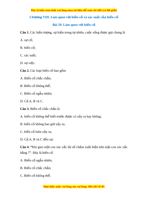 Đây là bản xem th , vu ử i lòng mua tài li u ệ đ xe ể m chi ti t ế (có l i ờ gi i ả ) Chư ng ơ VIII. Làm quen v i ớ bi n c ế và xác s ố u t ấ c a bi ủ n c ế ố Bài 29. Làm quen v i ớ bi n c ế ố Câu 1. Các hi n t ệ ư ng, ợ s ki ự n t ệ rong t nhi ự ên, cu c s ộ ng đ ố ư c g ợ i ọ chung là A. sự cố; B. bi n c ế ố; C. xác suất; D. sự việc. Câu 2. Các lo i ạ bi n c ế ố bao gồm A. Bi n c ế ố chắc ch n ắ ; B. Bi n ế cố không thể; C. Bi n ế cố ng u nhi ẫ ên; D. Cả A, B và C. Câu 3. Bi n c ế ố ch c ắ ch n ắ là A. bi n c ế ố không th bi ể t ế trư c ớ đư c ợ có x y r ả a hay không; B. bi n c ế ố không bao gi x ờ y ả ra; C. bi n c ế ố luôn x y ả ra; D. Cả A, B và C đ u s ề ai. Câu 4. “Khi gieo m t ộ con xúc x c ắ thì s ch ố m ấ xu t ấ hi n t ệ rên m t ặ con xúc x c ắ b ng 7”. Đ ằ ây là bi n c ế ố A. Bi n c ế ố ngẫu nhiên; B. Bi n ế cố ch c ch ắ n ắ ; C. Bi n ế cố không thể; M i
