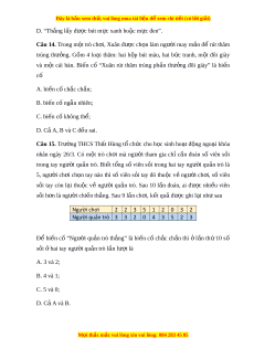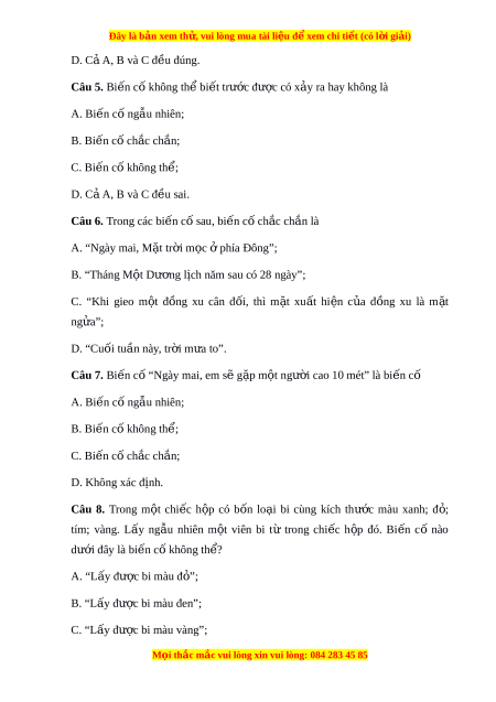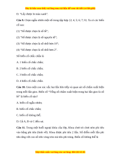 Đây là bản xem th , vu ử i lòng mua tài li u ệ đ xe ể m chi ti t ế (có l i ờ gi i ả ) D. Cả A, B và C đ u đúng ề . Câu 5. Bi n c ế ố không th bi ể t ế trư c đ ớ ư c ợ có x y ả ra hay không là A. Bi n c ế ố ngẫu nhiên; B. Bi n ế cố ch c ch ắ n ắ ; C. Bi n ế cố không thể; D. Cả A, B và C đ u s ề ai. Câu 6. Trong các bi n ế cố sau, bi n c ế ch ố c ắ ch n l ắ à A. “Ngày mai, M t ặ tr i ờ m c ọ phí ở a Đông”; B. “Tháng M t ộ Dư ng l ơ ch năm ị sau có 28 ngày”; C. “Khi gieo m t ộ đ ng ồ xu cân đ i ố , thì m t ặ xu t ấ hi n ệ c a ủ đ ng ồ xu là m t ặ ng a” ử ; D. “Cuối tu n này ầ , tr i ờ m a ư to”. Câu 7. Bi n c ế ố “Ngày mai, em s g ẽ p m ặ t ộ ngư i ờ cao 10 mét” là bi n ế cố A. Bi n c ế ố ngẫu nhiên; B. Bi n ế cố không thể; C. Bi n ế cố ch c ch ắ n ắ ; D. Không xác định. Câu 8. Trong m t ộ chi c ế h p ộ có b n ố lo i ạ bi cùng kích thư c ớ màu xanh; đ ; ỏ tím; vàng. L y ấ ng u ẫ nhiên m t ộ viên bi từ trong chi c ế h p ộ đó. Bi n ế cố nào dư i ớ đây là bi n c ế ố không th ? ể A. “Lấy đư c ợ bi màu đ ” ỏ ; B. “Lấy đư c bi ợ màu đen”; C. “Lấy đư c bi ợ màu vàng”; M i