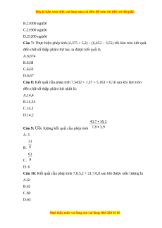 tính 7,5432 + 1,37 + 5,163 + 0,16 sau khi làm tròn đ n ch ế s ữ ố th p ậ phân th nh ứ t ấ là: A.14,4 B.14,24 C.14,3 D.14,2 43,7 18,2 Câu 9: c Ướ lư ng k ợ t ế quả c a phép t ủ ính 7,8 3,9 A. 5 31 B. 6 61 C. 9 D. 6 Câu 10: K t ế quả c a phép ủ
