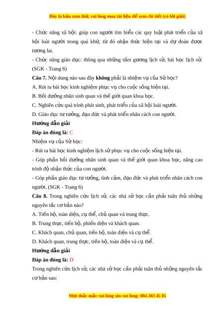 Đây là bản xem th , vu ử i lòng mua tài li u ệ đ xe ể m chi ti t ế (có l i ờ gi i ả ) - Chức năng xã h i ộ : giúp con ngư i ờ tìm hi u ể các quy lu t ậ phát tri n ể c a ủ xã h i ộ loài ngư i ờ trong quá kh , ứ từ đó nh n ậ th c ứ hi n ệ t i ạ và dự đoán đư c ợ tư ng l ơ ai. - Chức năng giáo d c: ụ thông qua nh ng ữ t m ấ gư ng ơ l ch ị s , ử bài h c ọ l ch ị s . ử (SGK - Trang 6) Câu 7. N i
