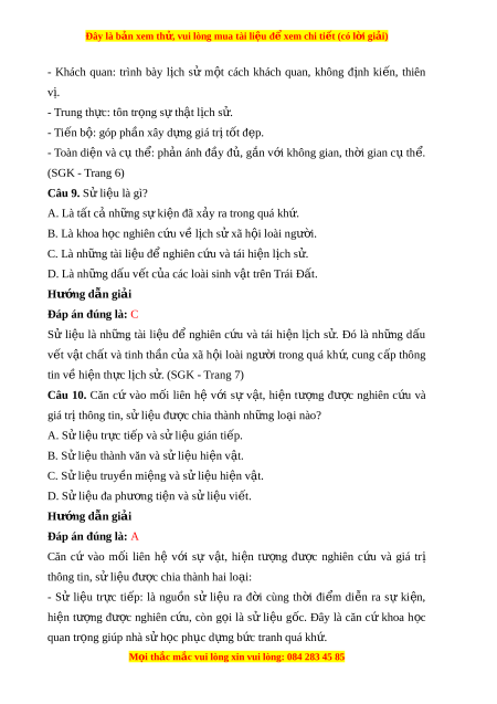 ộ cách khách quan, không đ nh ị ki n, ế thiên vị. - Trung th c: ự tôn tr ng s ọ t ự h t ậ l ch s ị . ử - Ti n b ế : ộ góp phần xây d ng gi ự á tr t ị ốt đ p. ẹ - Toàn di n ệ và cụ th : ể ph n ả ánh đ y ầ đ , ủ g n ắ v i ớ không gian, th i ờ gian c t ụ h . ể (SGK - Trang 6) Câu 9. S l ử i u l ệ à gì? A. Là t t ấ c nh ả ng s ữ ki ự n đã x ệ y ả ra trong quá kh . ứ B. Là khoa h c nghi ọ ên c u v ứ ề l ch s ị xã h ử i ộ loài ngư i ờ . C. Là nh ng ữ tài li u đ ệ nghi ể ên c u ứ và tái hi n l ệ ch ị s . ử D. Là nh ng d ữ u v ấ t ế c a ủ các loài sinh v t ậ trên Trái Đ t ấ . Hư ng d ớ ẫn gi i ả Đáp án đúng là: C Sử li u ệ là nh ng ữ tài li u ệ để nghiên c u ứ và tái hi n ệ l ch ị s . ử Đó là nh ng ữ d u ấ v t ế v t ậ ch t ấ và tinh th n ầ c a ủ xã h i ộ loài ngư i ờ trong quá kh , ứ cung c p ấ thông tin v hi ề n t ệ h c l ự ch s ị . ử (SGK - Trang 7)