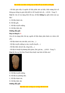 Câu 10. Căn cứ vào m i ố liên hệ v i ớ sự v t ậ , hi n ệ tư ng ợ đư c ợ nghiên c u ứ và giá trị thông tin, s l ử i u đ ệ ư c chi ợ a thành nh ng l ữ o i ạ nào? A. S l ử i u t ệ r c t ự i p và s ế ử li u gi ệ án ti p. ế B. S l ử i u t ệ hành văn và s l ử i u hi ệ n v ệ t ậ . C. S l ử i u t ệ ruy n m ề i ng và s ệ ử li u hi ệ n v ệ t ậ . D. S l ử i u đa ph ệ ư ng ơ ti n và s ệ l ử i u vi ệ t ế . Hư ng d ớ ẫn gi i ả Đáp án đúng là: A Căn cứ vào m i ố liên hệ v i ớ sự v t ậ , hi n ệ tư ng ợ đư c ợ nghiên c u ứ và giá trị thông tin, sử li u đ ệ ư c ợ chia thành hai lo i ạ : - Sử li u ệ tr c ự ti p: ế là ngu n ồ sử li u ệ ra đ i ờ cùng th i ờ đi m ể di n ễ ra sự ki n, ệ hiện tư ng ợ đư c ợ nghiên c u, ứ còn g i ọ là sử li u ệ g c. ố Đây là căn c ứ khoa h c ọ quan tr ng gi ọ úp nhà sử h c ph ọ c ụ d ng b ự c t ứ ranh quá kh . ứ M i ọ thắc m c