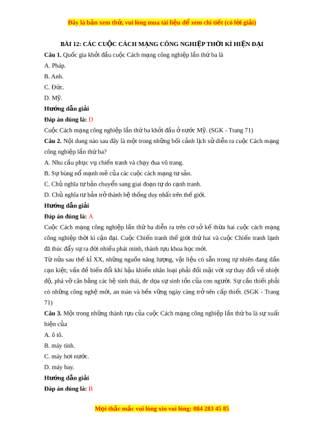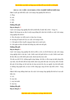 Đây là bản xem th , vu ử i lòng mua tài li u ệ đ xe ể m chi ti t ế (có l i ờ gi i ả ) BÀI 12: CÁC CU C Ộ CÁCH M N Ạ G CÔNG NGHI P Ệ TH I Ờ KÌ HI N Ệ Đ I Ạ Câu 1. Qu c ố gia kh i ở đ u c ầ uộc Cách m ng c ạ ông nghi p l ệ n t ầ h ba ứ là A. Pháp. B. Anh. C. Đ c ứ . D. Mỹ. Hư n ớ g d n ẫ gi i ả Đáp án đúng là: D Cu c
