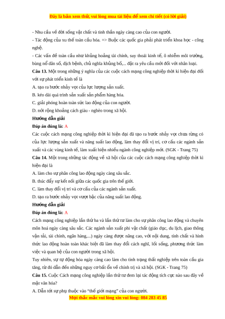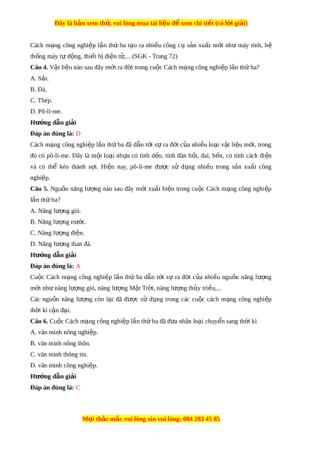 đó có pô-li-me. Đây là m t ộ lo i ạ nh a ự có tính d o, ẻ tính đàn h i ồ , dai, b n, ề có tính cách đi n ệ và có thể kéo thành s i ợ . Hi n ệ nay, pô-li-me đư c ợ sử d ng ụ nhi u ề trong s n ả xu t ấ công nghi p. ệ Câu 5. Ngu n ồ năng lư ng ợ nào sau đây m i ớ xu t ấ hi n ệ trong cu c ộ Cách m ng ạ công nghi p ệ lần thứ ba? A. Năng lư ng ợ gió. B. Năng lư ng n ợ ư c ớ . C. Năng lư ng đi ợ n. ệ D. Năng lư ng ợ than đá. Hướng d n ẫ gi i ả Đáp án đúng là: A Cu c ộ Cách m ng ạ công nghi p ệ l n ầ thứ ba d n ẫ t i ớ sự ra đ i ờ c a ủ nhi u ề ngu n ồ năng lư ng ợ mới nh nă ư ng lư ng ợ gió, năng lư ng ợ M t ặ Tr i ờ , năng lư ng t ợ h y ủ tri u,... ề Các ngu n ồ năng lư ng ợ còn l i ạ đã đư c ợ sử d ng ụ trong các cu c ộ cách m ng ạ công nghi p ệ thời kì cận đại. Câu 6. Cu c