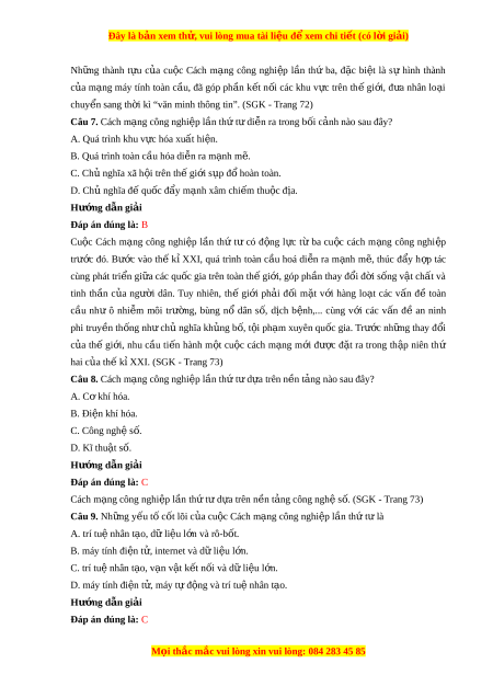 Đây là bản xem th , vu ử i lòng mua tài li u ệ đ xe ể m chi ti t (c ế ó l i ờ gi i ả ) Cách mạng công nghi p ệ l n ầ thứ ba t o ạ ra nhi u ề công cụ s n ả xu t ấ m i ớ như máy tính, hệ th ng m ố áy t đ ự ng, t ộ hi t ế bị đi n t ệ ,... ử (SGK - Trang 72) Câu 4. Vật li u nà ệ o sau đây m i ớ ra đ i ờ trong cu c ộ Cách m ng c ạ ông nghi p l ệ ần thứ ba? A. Sắt. B. Đá. C. Thép. D. Pô-li-me. Hướng d n ẫ gi i ả Đáp án đúng là: D Cách mạng công nghi p ệ l n ầ thứ ba đã d n ẫ t i ớ s ự ra đ i ờ c a ủ nhi u ề lo i ạ v t ậ li u ệ m i ớ , trong