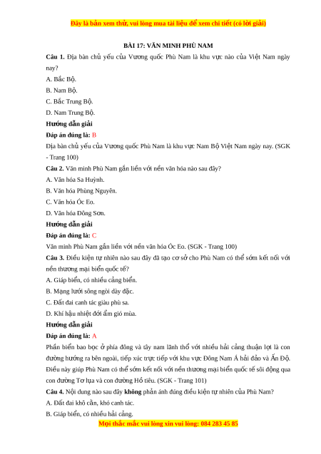 BÀI 17: VĂN MINH PHÙ NAM Câu 1. Đ a ị bàn chủ y u ế c a ủ Vư ng ơ qu c ố Phù Nam là khu v c ự nào c a ủ Vi t ệ Nam ngày nay? A. Bắc B . ộ B. Nam B . ộ C. Bắc Trung B . ộ D. Nam Trung B . ộ Hư n ớ g d n ẫ gi i ả Đáp án đúng là: B Đ a ị bàn chủ y u ế c a ủ Vư ng ơ qu c ố Phù Nam là khu v c ự Nam B V ộ i t ệ Nam ngày nay. (SGK - Trang 100)