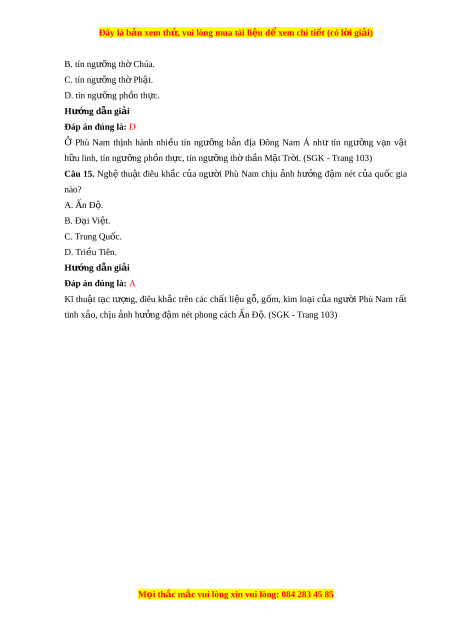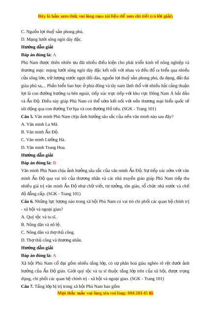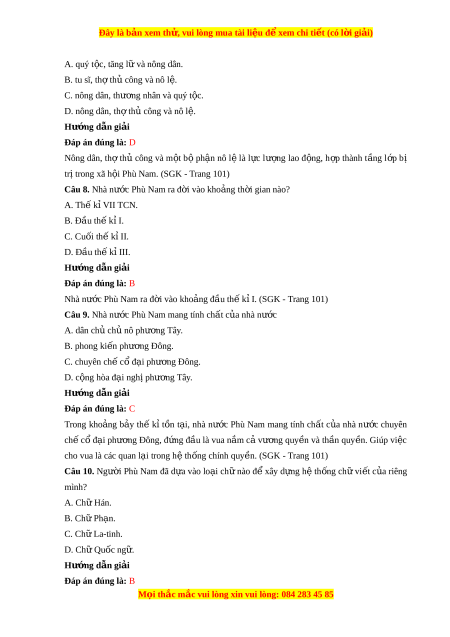 ộ Phù Nam. (SGK - Trang 101) Câu 8. Nhà nư c ớ Phù Nam ra đ i ờ vào kho ng t ả h i ờ gian nào? A. Thế kỉ VII TCN. B. Đầu th k ế ỉ I. C. Cu i ố th k ế II. ỉ D. Đầu thế k III. ỉ Hư n ớ g d n ẫ gi i ả Đáp án đúng là: B Nhà nư c ớ Phù Nam ra đ i ờ vào kho ng đ ả u t ầ h k ế I. (S ỉ GK - Trang 101) Câu 9. Nhà nư c ớ Phù Nam mang tính ch t ấ của nhà nước A. dân ch c ủ hủ nô phư ng ơ Tây. B. phong kiến phư ng Đ ơ ông. C. chuyên chế c đ ổ ại phư ng Đ ơ ông. D. c ng