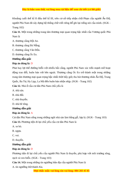 người Phù Nam đã xây d ng ự h ệ th ng ố ch vi ữ t ế riêng đ ghi ể l i ạ ti ng ế nói c a ủ mình. (SGK - Trang 102) Câu 11. M t ộ trong nh ng ữ trung tâm thư ng ơ m i ạ quan tr ng ọ b c ậ nh t ấ c a ủ Vư ng ơ qu c ố Phù Nam là A. thư ng ơ cảng H i ộ An. B. thư ng c ơ ảng Đà Nẵng. C. thư ng c ơ ảng Vân Đ n. ồ D. thư ng ơ cảng Óc Eo. Hướng d n ẫ gi i ả Đáp án đúng là: D Phát huy l i ợ thế đư ng ờ bi n ể v i ớ nhi u ề h i ả c ng, ả ngư i ờ Phù Nam xúc ti n ế m nh ạ m ẽ ho t ạ đ ng ộ trao đ i ổ , buôn bán v i ớ bên ngoài. Thư ng ơ c ng ả Óc Eo trở thành m t ộ trong nh ng ữ trung tâm thư ng m ơ ại quan tr ng b ọ c ậ nhất thời bấy gi , t ờ hu hút thư ng ơ nhân n Đ Ấ , ộ Trung Qu c ố , Ba T , H ư y L p, L ạ a Mã đ n buôn bá ế n nh n ộ nh p. (S ị GK - Trang 102) Câu 12. Nhà c ở a ủ c dâ ư n Phù Nam chủ y u l ế à A. nhà sàn. B. nhà đất. C. nhà thuy n. ề D. nhà bê tông. Hướng d n ẫ gi i ả Đáp án đúng là: A Cư dân Phù Nam s ng t ố rong nh ng ngôi ữ nhà sàn làm b ng g ằ , ỗ l p l ợ á. (SGK - Trang 103) Câu 13. Phư ng t ơ i n ệ đi lại chủ y u c ế a ủ cư dân Phù Nam là A. xe bò. B. ng a ự . C. voi. D. thuy n. ề Hướng d n ẫ gi i ả Đáp án đúng là: D Phư ng ơ ti n ệ đi l i ạ chủ y u ế c a ủ ngư i ờ Phù Nam là thuy n, ề phù h p ợ v i ớ môi trư ng ờ sông,