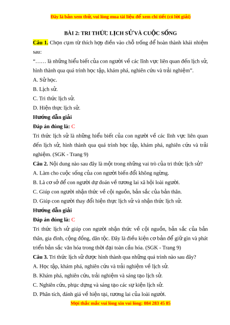 Đây là bản xem th , vu ử i lòng mua tài li u ệ đ xe ể m chi ti t (c ế ó l i ờ gi i ả ) Hư ng d ớ ẫn gi i ả Đáp án đúng là: A Tri th c ứ l ch ị sử là nh ng ữ hi u ể bi t ế c a ủ con ngư i ờ về các lĩnh v c ự liên quan đ n ế l ch ị s ,