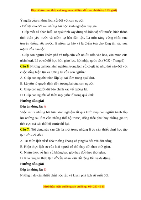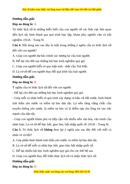 Đây là bản xem th , vu ử i lòng mua tài li u ệ đ xe ể m chi ti t ế (có l i ờ gi i ả ) Ý nghĩa c a t ủ ri th c l ứ ch s ị ử đối v i ớ con ngư i ờ : - Để l i ạ cho đ i ờ sau nh ng bài ữ h c ọ kinh nghi m ệ quý giá. - Giúp m i ỗ cá nhân hi u ể rõ quá trình xây d ng ự và b o ả v ệ đ t ấ nư c, ớ hình thành tinh th n ầ yêu nư c ớ và ni m ề tự hào dân t c. ộ Là n n ề t ng ả v ng ữ ch c ắ c a ủ truy n ề th ng ố yêu nư c, ớ là ni m ề tự hào và là đi m ể t a ự cho lòng tin vào s c ứ m nh c ạ a ủ dân t c. ộ - Giúp con ngư i ờ khám phá và ti p ế c n ậ v i ớ nhi u ề n n ề văn hóa, văn minh c a ủ nhân lo i ạ . Là c s ơ đ ở h ể c ọ h i ỏ , giao l u, h ư i ộ nh p ậ qu c ố t . ( ế SGK - Trang 9) Câu 6. Nh ng bài ữ h c ọ kinh nghi m ệ trong l ch s ị có gi ử á tr nh ị t ư h nào đ ế i ố v i ớ cu c s ộ ống hi n t ệ i ạ và tư ng l ơ ai c a ủ con ngư i ờ ? A. Giúp con ngư i ờ tránh l p l ặ i ạ sai l m ầ trong quá kh . ứ B. Là y u t ế ố quy t ế đ nh đ ị n ế tư ng l ơ ai c a con ủ ngư i ờ . C. Giúp con ngư i ờ d báo chí ự nh xác về tư ng l ơ ai. D. Giúp con ngư i ờ kế th a ừ m i ọ y u t ế t ố rong quá kh . ứ Hư ng ớ d n gi ẫ i ả Đáp án đúng là: A Việc rút ra nh ng ữ bài h c ọ kinh nghi m