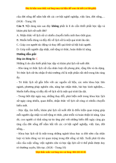 ộ dung nào sau đây là m t ộ trong nh ng vai ữ trò c a ủ tri th c ứ l ch s ị ? ử A. Làm cho cu c s ộ ng c ố a ủ con ngư i ờ bi n đ ế i ổ không ng ng. ừ B. Là c s ơ đ ở con ng ể ư i ờ d đoán v ự t ề ư ng ơ lai xã h i ộ loài ngư i ờ . C. Giúp con ngư i ờ nh n t ậ h c v ứ ề c i ộ ngu n, b ồ n s ả c c ắ a ủ b n t ả hân. D. Giúp con ngư i ờ thay đ i ổ hi n t ệ h c l ự ch s ị ử và nh n t ậ h c l ứ ch s ị . ử Hư ng ớ d n gi ẫ i ả Đáp án đúng là: C Tri th c ứ l ch ị sử giúp con ngư i ờ nh n ậ th c ứ về c i ộ ngu n, ồ b n ả s c ắ c a ủ b n ả thân, gia đình, c ng ộ đ ng, ồ dân t c. ộ Đây là đi u ề ki n ệ c ơ b n ả đ ể gi ữ gìn và phát tri n b ể n ả sắc văn hóa trong th i ờ đ i ạ toàn c u hóa. ầ (SGK - Trang 9) Câu 3. Tri th c ứ lịch s đ ử ư c