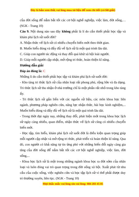 ạ và luôn đóng vai trò quan tr ng ọ trong đ i ờ s ng ố xã h i ộ . Xu t ấ phát từ nhu cầu c a ủ cu c ộ s ng, ố vi c ệ nghiên c u ứ và h c ọ t p ậ l ch ị sử vì th ế ph i ả đư c ợ duy trì thư ng xuyên, l ờ iên t c. ( ụ SGK - Trang 10) Câu 8. M t ộ trong nh ng ữ l i ợ ích c a ủ vi c ệ h c ọ t p ậ và khám phá l ch ị s ử su t ố đ i ờ là A. giúp con ngư i ờ c p nh ậ t ậ và m r ở ng t ộ ri th c. ứ B. tách r i ờ l ch ị s v ử i ớ cu c ộ s ng c ố a ủ con ngư i ờ . C. giúp con ngư i ờ phát tri n v ể c ề t ả h ch ể t ấ và trí óc.