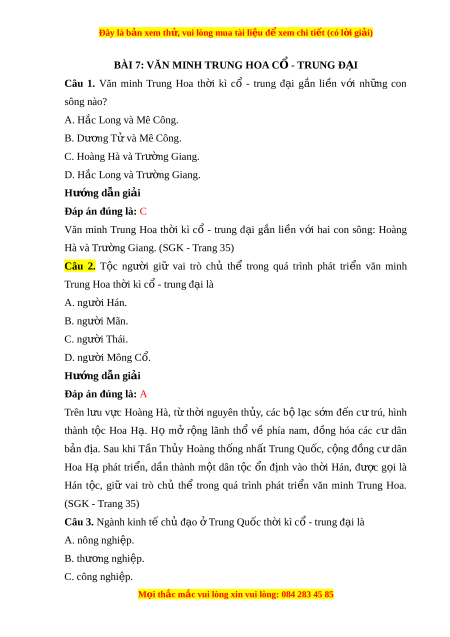 Câu 1. Văn minh Trung Hoa th i ờ kì cổ - trung đ i ạ g n ắ li n ề v i ớ nh ng ữ con sông nào? A. H c ắ Long và Mê Công. B. Dư ng ơ T và M ử ê Công. C. Hoàng Hà và Trư ng G ờ iang. D. H c ắ Long và Trư ng G ờ iang. Hư ng ớ d n gi ẫ i ả Đáp án đúng là: C Văn minh Trung Hoa th i ờ kì cổ - trung đ i ạ g n ắ li n ề v i ớ hai con sông: Hoàng Hà và Trư ng G ờ iang. (SGK - Trang 35) Câu 2. T c ộ ngư i