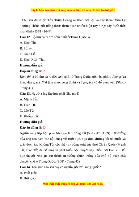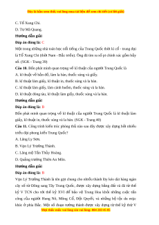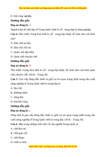 Đây là bản xem th , vu ử i lòng mua tài li u ệ đ xe ể m chi ti t (c ế ó l i ờ gi i ả ) D. th công ủ nghi p. ệ Hư ng d ớ ẫn gi i ả Đáp án đúng là: A Ngành kinh tế ch đ ủ o ạ ở Trung Quốc th i ờ kì c - ổ trung đ i ạ là nông nghi p. ệ Câu 4. Nhà nư c ớ Trung Hoa th i ờ kì cổ - trung đ i ạ đư c ợ t ổ ch c ứ theo mô hình nào? A. Dân ch t ủ s ư n. ả B. Dân ch ch ủ ủ nô. C. Quân ch l ủ p ậ hi n. ế D. Quân ch chuyên ch ủ . ế Hư ng d ớ ẫn gi i ả Đáp án đúng là: D Nhà nư c ớ Trung Hoa th i ờ kì cổ - trung đ i ạ đư c ợ tổ ch c ứ theo mô hình quân chủ chuyên ch . ( ế SGK - Trang 36) Câu 5. Giai c p ấ đông đ o ả nh t