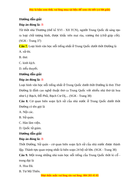 ơ (thế kỉ XVI - XII TCN), ngư i ờ Trung Qu c ố đã sáng t o ạ ra lo i ạ chữ tư ng ợ hình, đư c ợ kh c ắ trên mai rùa, xư ng ơ thú (chữ giáp c t ố ). (SGK - Trang 37) Câu 7. Lo i ạ hình văn h c n ọ ổi ti ng nh ế t ấ ở Trung Qu c d ố ư i ớ th i ờ Đư ng l ờ à A. sử thi. B. th . ơ C. kinh kịch. D. ti u t ể huy t ế . Hư ng ớ d n gi ẫ i ả Đáp án đúng là: B Lo i ạ hình văn h c ọ n i ổ ti ng ế nh t ấ ở Trung Qu c ố dư i ớ th i ờ Đư ng ờ là th . ơ Thơ Đư ng ờ là đ nh ỉ cao nghệ thu t ậ thơ ca Trung Qu c ố v i ớ nhi u ề nhà thơ tài hoa nh L ư ý B ch, ạ Đỗ Ph , B ủ ch C ạ ư Dị,... (SGK - Trang 38)