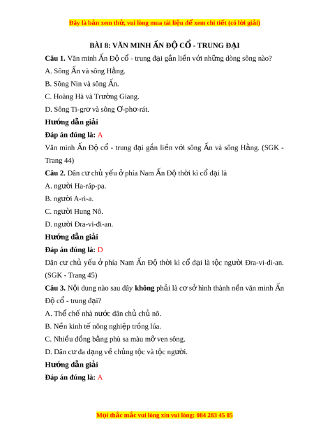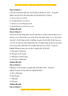 Đây là bản xem th , vu ử i lòng mua tài li u ệ đ xe ể m chi ti t ế (có l i ờ gi i ả ) BÀI 8: VĂN MINH N Ấ Đ C Ộ - Ổ TRUNG Đ I Ạ Câu 1. Văn minh n Đ Ấ c ộ - ổ trung đ i ạ g n l ắ i n v ề i ớ nh ng dòng s ữ ông nào? A. Sông n và s Ấ ông H ng. ằ B. Sông Nin và sông n. Ấ C. Hoàng Hà và Trư ng G ờ iang. D. Sông Ti-gr và s ơ ông - Ơ ph - ơ rát. Hư ng ớ d n gi ẫ i ả Đáp án đúng là: A Văn minh n Ấ Độ cổ - trung đ i ạ g n ắ li n ề v i ớ sông n Ấ và sông H ng. ằ (SGK - Trang 44) Câu 2. Dân c ch ư ủ y u ế phí ở a Nam n Đ Ấ ộ th i ờ kì c đ ổ i ạ là A. ngư i ờ Ha-ráp-pa. B. ngư i ờ A-ri-a. C. ngư i ờ Hung Nô. D. ngư i ờ Đra-vi-đi-an. Hư ng ớ d n gi ẫ i ả Đáp án đúng là: D Dân cư chủ y u ế ở phía Nam n Ấ Độ th i ờ kì cổ đ i ạ là t c ộ ngư i ờ Đra-vi-đi-an. (SGK - Trang 45) Câu 3. N i