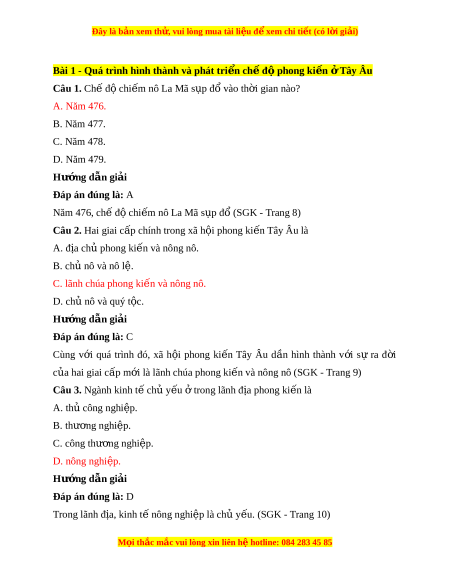 Bài 1 - Quá trình hình thành và phát tri n ch ể đ ế pho ộ ng ki n ế ở Tây Âu Câu 1. Chế đ chi ộ m ế nô La Mã s p đ ụ ổ vào th i ờ gian nào? A. Năm 476. B. Năm 477. C. Năm 478. D. Năm 479. Hư ng d ớ ẫn gi i ả Đáp án đúng là: A Năm 476, chế đ chi ộ m ế nô La Mã s p đ ụ ổ (SGK - Trang 8)