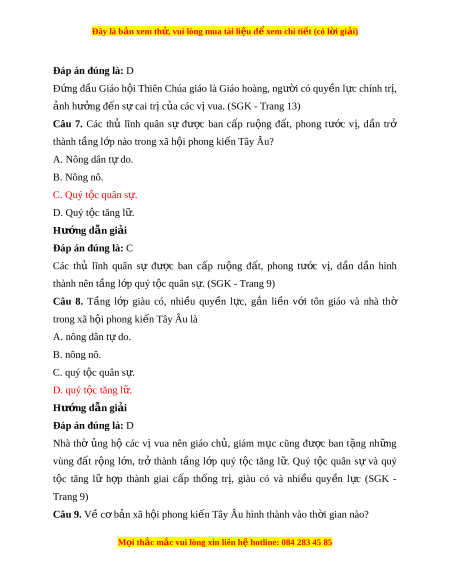Các thủ lĩnh quân sự đư c ợ ban c p ấ ru ng ộ đ t ấ , phong tư c ớ v ,ị d n ầ d n ầ hình thành nên tầng l p quý t ớ c ộ quân s . ự (SGK - Trang 9) Câu 8. Tầng l p ớ giàu có, nhi u ề quy n ề l c, ự g n ắ li n ề v i ớ tôn giáo và nhà thờ trong xã h i ộ phong ki n ế Tây Âu là A. nông dân t do. ự B. nông nô. C. quý t c quân s ộ . ự D. quý t c ộ tăng l . ữ Hư ng d ớ ẫn gi i ả Đáp án đúng là: D Nhà thờ ng