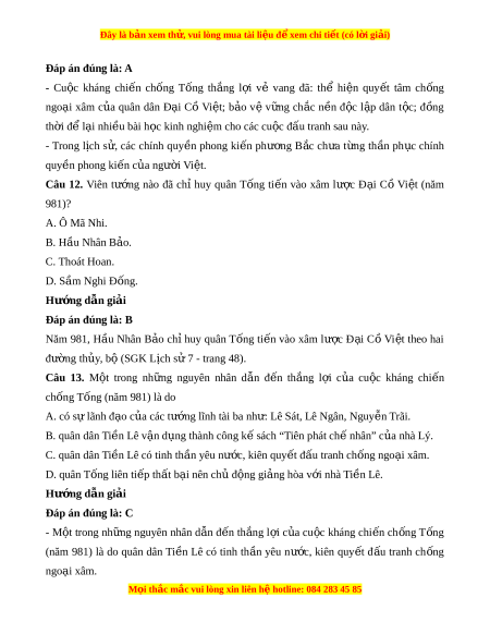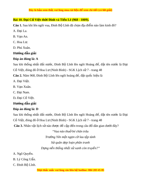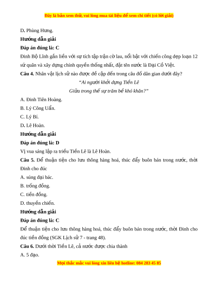 Đây là bản xem th , vu ử i lòng mua tài li u ệ đ xe ể m chi ti t (c ế ó l i ờ gi i ả ) D. Phùng H ng. ư Hư ng d ớ ẫn gi i ả Đáp án đúng là: C Đinh Bộ Lĩnh g n ắ li n v ề i ớ sự tích t p t ậ r n c ậ l ờ au, n i ổ b t ậ v i ớ chi n công d ế p l ẹ o n 12 ạ sứ quân và xây d ng ự chính quy n t ề hống nh t ấ , đ t ặ tên nư c l ớ à Đ i ạ C ồ Vi t ệ . Câu 4. Nhân v t ậ l ch s ị nào ử đư c đ ợ c ề p đ ậ n t ế rong câu đ dân gi ố an dư i ớ đây? “Ai ngư i ờ kh i ở d ng T ự i n ề Lê Gi a t ữ rong th s