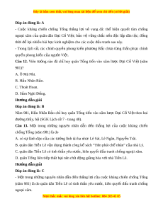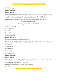 D. nho giáo và Đ o gi ạ áo b nhà n ị ư c ớ h n ch ạ ế phát tri n t ể rong xã h i ộ . Hư ng d ớ ẫn gi i ả Đáp án đúng là: B Th i ờ Đinh-Ti n ề Lê, giáo d c ụ ch a ư phát tri n, ể nhi u ề ngư i ờ không bi t ế ch . ữ Các nhà sư h c ọ kinh Ph t ậ , bi t ế chữ Hán, có h c ọ th c ứ uyên bác nên đư c ợ tri u ề đình tr ng ọ d ng. ụ Câu 10. Nhà Ti n L ề ê đư c ợ thành l p t ậ rong hoàn c nh ả nh t ư h nào? ế A. Đất nư c ớ thái bình, kinh t phát ế tri n t ể h nh đ ị t ạ . B. Cu c ộ kháng chi n ch ế ống T ng đã ố toàn th ng. ắ