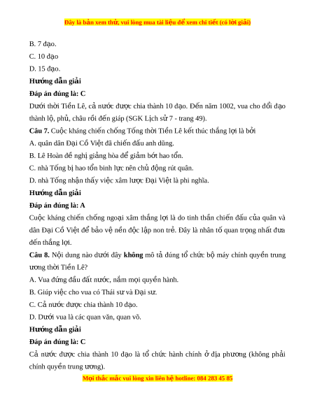 Đây là bản xem th , vu ử i lòng mua tài li u ệ đ xe ể m chi ti t (c ế ó l i ờ gi i ả ) B. 7 đ o. ạ C. 10 đ o ạ D. 15 đ o. ạ Hư ng d ớ ẫn gi i ả Đáp án đúng là: C Dư i ớ th i ờ Ti n ề Lê, cả nư c ớ đư c ợ chia thành 10 đ o. ạ Đ n ế năm 1002, vua cho đ i ổ đ o ạ thành l , ộ ph , châu r ủ i ồ đ n gi ế áp (SGK L ch s ị 7 - ử trang 49).