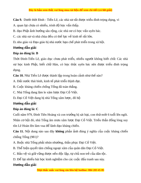 Đây là bản xem th , vu ử i lòng mua tài li u ệ đ xe ể m chi ti t (c ế ó l i ờ gi i ả ) Câu 9. Dư i ớ th i ờ Đinh - Ti n ề Lê, các nhà sư r t ấ đư c t ợ ri u đì ề nh tr ng ọ d ng, vì ụ A. quan l i ạ ch a có ư nhi u, ề trình đ h ộ c ọ v n t ấ h p. ấ B. đ o Ph ạ t ậ nh ả hư ng s ở âu r ng, các nhà ộ s có h ư c ọ v n uyên bác. ấ C. các nhà s và nhà chùa ư đ u có t ề h l ế c v ự ề kinh tế r t ấ l n. ớ