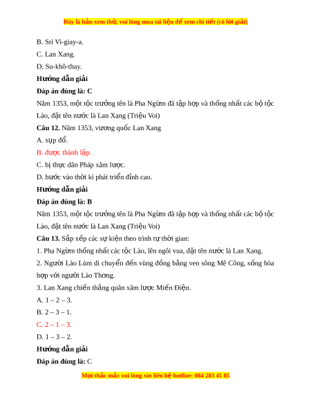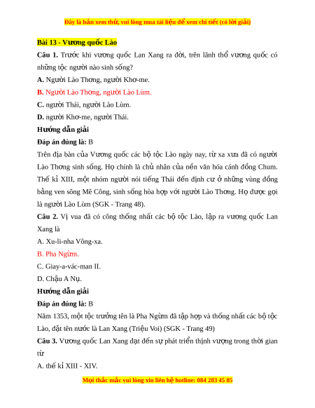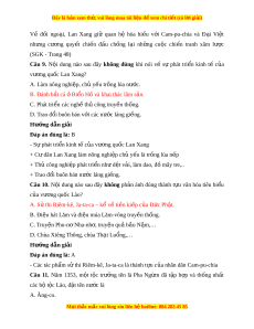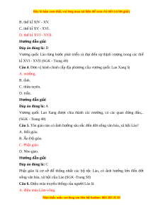 Đây là bản xem th , vu ử i lòng mua tài li u ệ đ xe ể m chi ti t (c ế ó l i ờ gi i ả ) Bài 13 - Vư ng q ơ uốc Lào Câu 1. Trư c ớ khi vư ng ơ qu c ố Lan Xang ra đ i ờ , trên lãnh thổ vư ng ơ qu c ố có nh ng t ữ c ộ ngư i ờ nào sinh sống? A. Ngư i ờ Lào Th ng, ơ ngư i ờ Kh - ơ me. B. Ngư i ờ Lào Th ng, ng ơ ư i ờ Lào Lùm. C. ngư i ờ Thái, ngư i ờ Lào Lùm. D. ngư i ờ Kh - ơ me, ngư i ờ Thái. Hư ng d ớ ẫn gi i ả Đáp án đúng là: B Trên đ a ị bàn c a ủ Vư ng ơ qu c ố các bộ t c