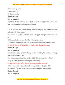 ầ rở nên đông đúc, đ i ờ sống thanh bình. C. Phát tri n nông nghi ể p, t ệ h công t ủ ruy n t ề h ng và ố buôn bán v i ớ nư c ớ ngoài. D. Kinh đô chuy n ể t ừ Viêng Chăn v M ề ư ng ờ Xoa (Luông Pha-bang). Hư ng d ớ ẫn gi i ả Đáp án đúng là: D Kinh đô c a ủ Vư ng ơ qu c ố Lan Xang ban đ u ầ ở Mư ng ờ Xoa (Luông-pha-bang), sau chuy n v ể ề Viêng Chăn. Câu 8. Vư ng