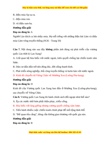 Đây là bản xem th , vu ử i lòng mua tài li u ệ đ xe ể m chi ti t (c ế ó l i ờ gi i ả ) B. đi u m ệ úa Ap-sa-ra. C. đi u m ệ úa xòe. D. vũ đi u s ệ am-ba. Hư ng d ớ ẫn gi i ả Đáp án đúng là: A Ngư i ờ Lào thích ca hát nh y ả múa. H ọ n i ổ ti ng ế v i ớ nh ng ữ đi u ệ hát Lăm và đi u ệ múa Lăm-vông truy n t ề h ng ( ố SGK - Trang 50) Câu 7. N i