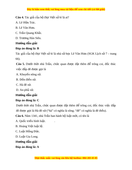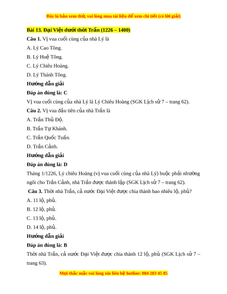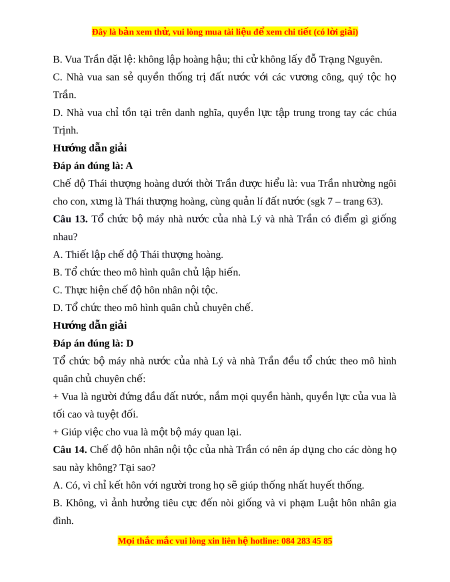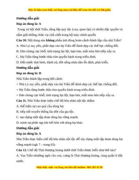 Đây là bản xem th , vu ử i lòng mua tài li u ệ đ xe ể m chi ti t (c ế ó l i ờ gi i ả ) Hư ng d ớ ẫn gi i ả Đáp án đúng là: A Trong xã h i ộ th i ờ Tr n, ầ t ng ầ l p ớ quý t c ộ (vua, quan l i ạ ) có nhi u ề đ c ặ quy n ề và n m ắ gi nh ữ ng ch ữ c v ứ ụ ch ch ủ ốt trong b m ộ áy chính quy n ề Câu 10. N i