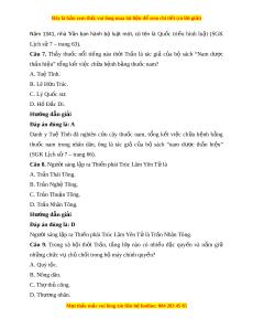 Câu 11. Nhà Trần th c hi ự n ch ệ đ ế ộ hôn nhân n i ộ t c nh ộ m ằ A. th hi ể n s ệ ự cao quý c a ủ dòng h . ọ B. ti p n ế ối truy n t ề h ng l ố âu đ i ờ c a gi ủ a t c. ộ C. t o d ạ ng m ự t ộ t p ậ đoàn dòng h v ọ ng m ữ nh. ạ D. tránh sự ph c t ứ p khi ạ k t ế hôn v i ớ dòng h khác. ọ Hư ng d ớ ẫn gi i ả Đáp án đúng là: A Nhà Tr n ầ th c ự hi n ệ ch ế đ ộ hôn nhân n i ộ t c ộ đ ể xây d ng ự m t ộ t p ậ đoàn dòng họ v ng m ữ nh ạ (sgk 7 – trang 63). Câu 12. Chế đ ộ Thái thư ng ợ hoàng dư i ớ th i ờ Tr n đ ầ ư c hi ợ u nh ể t ư h nào? ế A. Vua Tr n ầ như ng ờ ngôi cho con, x ng ư là Thái thư ng ợ hoàng, cùng qu n ả lí đ t ấ nư c. ớ M i