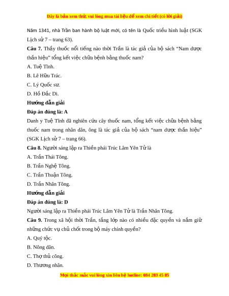 thuốc nam trong nhân dân, ông là tác giả c a ủ bộ sách “nam dư c ợ th n ầ hi u” ệ (SGK L ch s ị ử 7 – trang 66). Câu 8. Ngư i ờ sáng l p ậ ra Thi n ề phái Trúc Lâm Yên T l ử à A. Trần Thái Tông. B. Trần Ngh ệ Tông. C. Trần Thu n ậ Tông. D. Trần Nhân Tông. Hư ng d ớ ẫn gi i ả Đáp án đúng là: D Ngư i ờ sáng l p ậ ra Thi n ề phái Trúc Lâm Yên T l ử à Tr n N ầ hân Tông. Câu 9. Trong xã h i ộ th i ờ Tr n, ầ t ng ầ l p ớ nào có nhi u ề đ c ặ quy n ề và n m ắ giữ nh ng ch ữ c ứ v ch ụ ch ủ ốt trong b m ộ áy chính quy n? ề A. Quý t c. ộ B. Nông dân. C. Th t ợ h công. ủ D. Thư ng ơ nhân. M i