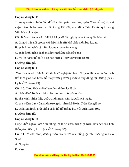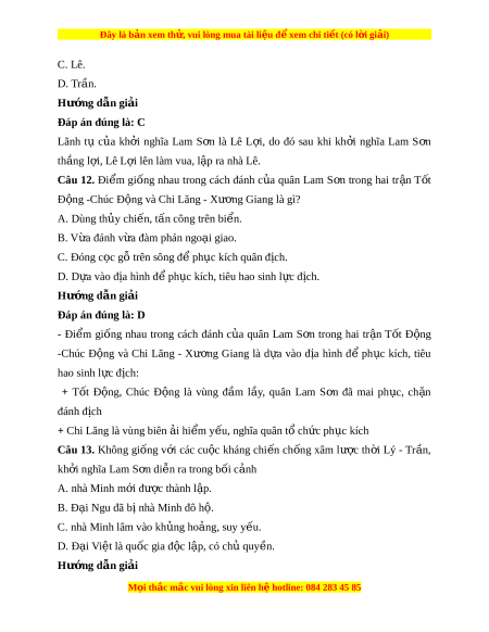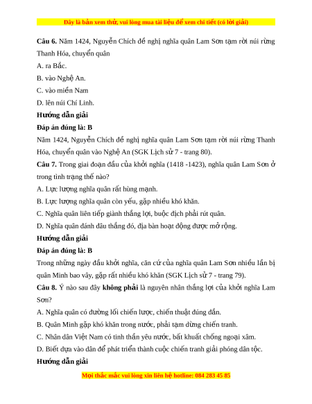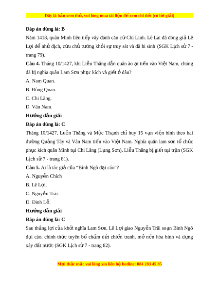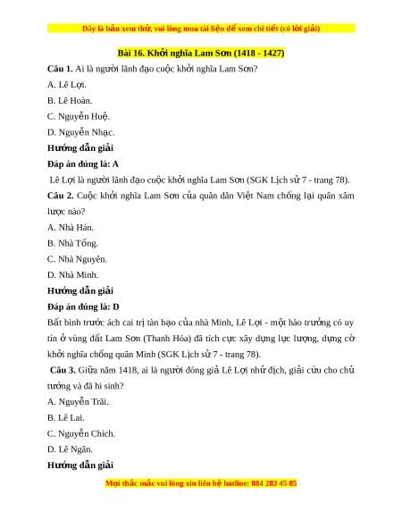 Đây là bản xem th , vu ử i lòng mua tài li u ệ đ xe ể m chi ti t (c ế ó l i ờ gi i ả ) Bài 16. Kh i ở nghĩa Lam S n ( ơ 1418 - 1427) Câu 1. Ai là ngư i ờ lãnh đ o cu ạ c ộ kh i ở nghĩa Lam S n? ơ A. Lê L i ợ . B. Lê Hoàn. C. Nguy n H ễ u . ệ D. Nguy n ễ Nh c. ạ Hư ng d ớ ẫn gi i ả Đáp án đúng là: A Lê L i ợ là ngư i ờ lãnh đ o ạ cu c kh ộ i ở nghĩa Lam S n ( ơ SGK L ch s ị 7 - ử trang 78). Câu 2. Cu c ộ kh i ở nghĩa Lam S n ơ c a ủ quân dân Vi t ệ Nam ch ng ố l i ạ quân xâm lư c ợ nào? A. Nhà Hán. B. Nhà Tống. C. Nhà Nguyên. D. Nhà Minh. Hư ng d ớ ẫn gi i ả Đáp án đúng là: D Bất bình trư c ớ ách cai trị tàn b o ạ c a ủ nhà Minh, Lê L i ợ - m t ộ hào trư ng ở có uy tín ở vùng đ t ấ Lam S n ơ (Thanh Hóa) đã tích c c ự xây d ng ự l c ự lư ng, ợ d ng ự cờ kh i