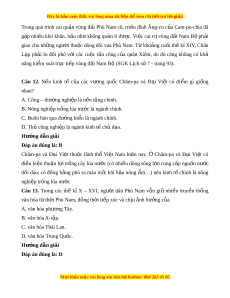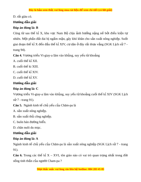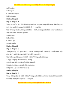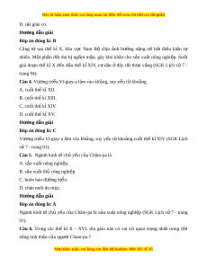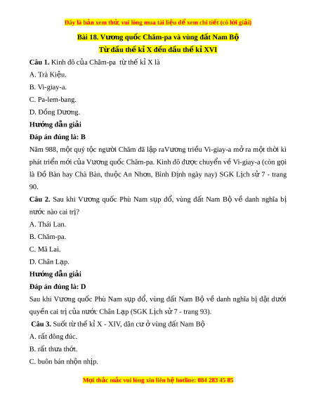 Đây là bản xem th , vu ử i lòng mua tài li u ệ đ xe ể m chi ti t (c ế ó l i ờ gi i ả ) Bài 18. Vư ng qu ơ c C ố hăm-pa và vùng đ t ấ Nam Bộ Từ đầu th k ế X ỉ đ n đ ế u t ầ h k ế X ỉ VI Câu 1. Kinh đô c a ủ Chăm-pa t t ừ h k ế X ỉ là A. Trà Ki u. ệ B. Vi-giay-a. C. Pa-lem-bang. D. Đồng Dư ng. ơ Hư ng d ớ ẫn gi i ả Đáp án đúng là: B Năm 988, m t ộ quý t c ộ ngư i ờ Chăm đã l p ậ raVư ng ơ tri u ề Vi-giay-a m ở ra m t ộ th i ờ kì phát tri n m ể i ớ c a ủ Vư ng ơ qu c C ố hăm-pa. Kinh đô đư c chuy ợ n ể v ề Vi-giay-a (còn g i ọ