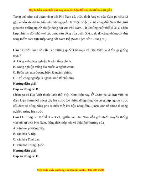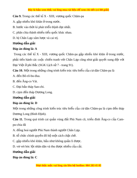 Đây là bản xem th , vu ử i lòng mua tài li u ệ đ xe ể m chi ti t (c ế ó l i ờ gi i ả ) Câu 9. Trong các th k ế ỉ X - XIII, vư ng ơ qu c ố Chăm-pa A. g p ặ nhi u khó khăn ề t ở rong nư c. ớ B. bư c vào t ớ h i ờ kì phát tri n t ể h nh đ ị t ạ nh t ấ . C. phân chia thành nhi u t ề i u qu ể ốc khác nhau. D. bị Chân L p xâm ạ lư c và cai ợ tr . ị Hư ng d ớ ẫn gi i ả Đáp án đúng là: A