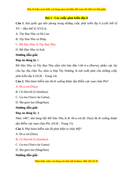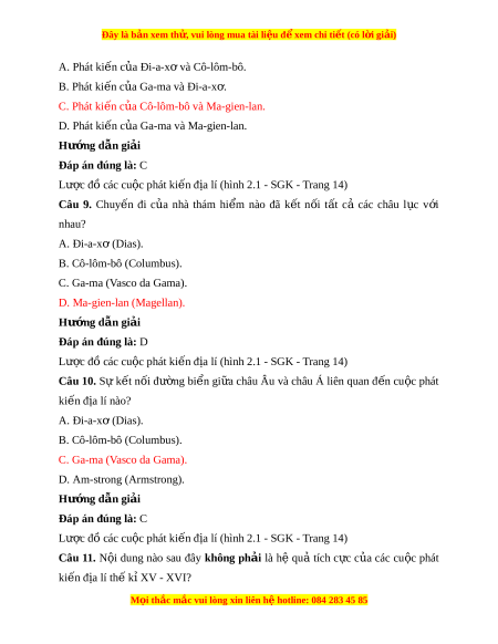 Đây là bản xem th , vu ử i lòng mua tài li u ệ đ xe ể m chi ti t (c ế ó l i ờ gi i ả ) A. Phát ki n c ế a ủ Đi-a-x và ơ Cô-lôm-bô. B. Phát ki n c ế a ủ Ga-ma và Đi-a-x . ơ C. Phát ki n c ế a
