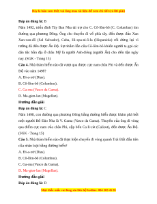 Xan-van-đô (Sal Salvador), Cuba, Hi-xpa-ni-ô-la (Hispaniola) r i ồ d ng ừ l i ạ vì tư ng ở đã đ n ế đư c ợ n Ấ Đ . ộ S ự nh m ầ l n ẫ c a ủ Cô-lôm-bô khi n ế ngư i ờ ta g i ọ các dân t c ộ b n ả đ a ị ở châu Mỹ là ngư i ờ Anh-điêng (ngư i ờ n Ấ ) cho đ n ế t n ậ ngày nay. (SGK - Trang 15) Câu 4. Nhà thám hi m ể nào đã vư t ợ qua đư c ợ c c ự nam châu Phi và đ n ế đư c ợ n Ấ Độ vào năm 1498? A. Đi-a-x ( ơ Dias). B. Cô-lôm-bô (Columbus). C. Ga-ma (Vasco da Gama). D. Ma-gien-lan (Magellan). Hư ng d ớ ẫn gi i ả Đáp án đúng là: C Năm 1498, con đư ng ờ qua phư ng ơ Đông b ng ằ đư ng ờ bi n ể đư c ợ khám phá b i ở m t ộ ngư i