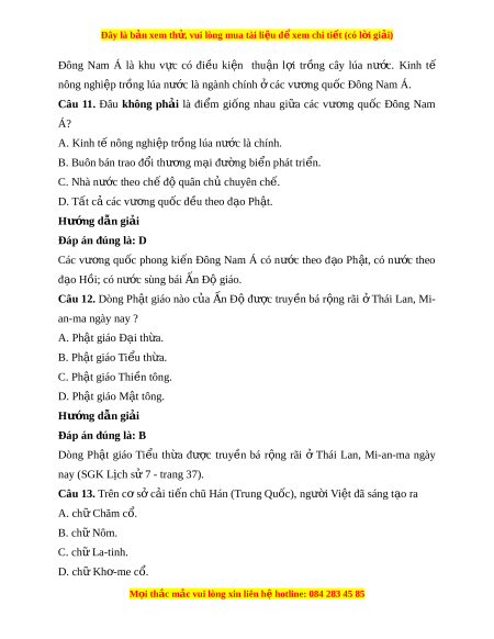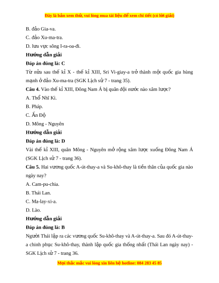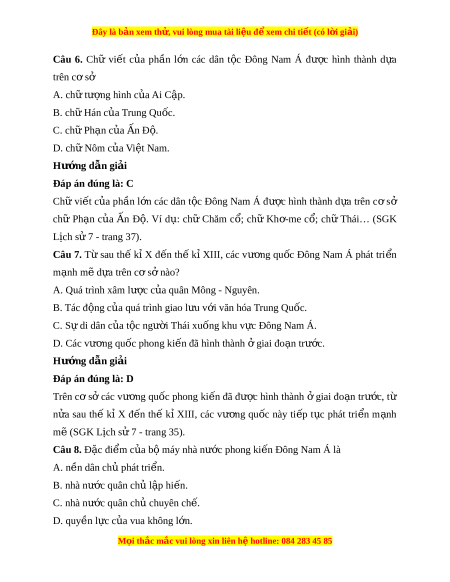 Đây là bản xem th , vu ử i lòng mua tài li u ệ đ xe ể m chi ti t (c ế ó l i ờ gi i ả ) Câu 6. Chữ vi t ế c a ủ ph n ầ l n ớ các dân t c ộ Đông Nam Á đư c ợ hình thành d a ự trên c s ơ ở A. chữ tư ng hì ợ nh c a ủ Ai C p. ậ B. ch H ữ án c a ủ Trung Quốc. C. ch Ph ữ n c ạ a ủ n Đ Ấ . ộ D. chữ Nôm c a ủ Vi t ệ Nam. Hư ng d ớ ẫn gi i ả Đáp án đúng là: C Chữ vi t ế c a ủ ph n ầ l n ớ các dân t c ộ Đông Nam Á đư c ợ hình thành d a ự trên c ơ sở chữ Ph n ạ c a ủ n Ấ Đ . ộ Ví d : ụ chữ Chăm c ; ổ chữ Kh - ơ me c ; ổ chữ Thái… (SGK Lịch s 7 - ử trang 37). Câu 7. Từ sau th ế kỉ X đ n ế th ế k ỉXIII, các vư ng ơ qu c ố Đông Nam Á phát tri n ể m nh ạ m d ẽ a ự trên cơ sở nào? A. Quá trình xâm lư c ợ c a quân M ủ ông - Nguyên. B. Tác đ ng c ộ a ủ quá trình giao l u ư v i ớ văn hóa Trung Qu c. ố C. S di ự dân c a t ủ c ộ ngư i ờ Thái xu ng khu v ố c Đ ự ông Nam Á. D. Các vư ng ơ qu c phong ki ố n đã ế hình thành gi ở ai đo n t ạ rư c. ớ Hư ng d ớ ẫn gi i ả Đáp án đúng là: D Trên cơ sở các vư ng ơ qu c ố phong ki n ế đã đư c ợ hình thành ở giai đo n ạ trư c, ớ từ n a ử sau thế kỉ X đ n