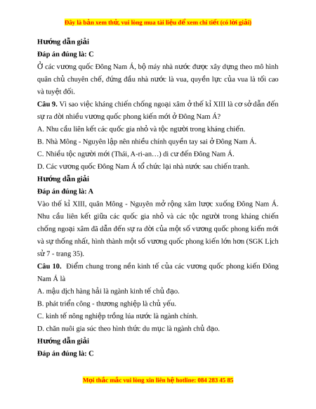 Đây là bản xem th , vu ử i lòng mua tài li u ệ đ xe ể m chi ti t (c ế ó l i ờ gi i ả ) Hư ng d ớ ẫn gi i ả Đáp án đúng là: C Ở các vư ng ơ qu c ố Đông Nam Á, b ộ máy nhà nư c ớ đư c ợ xây d ng ự theo mô hình quân chủ chuyên ch , ế đ ng ứ đ u ầ nhà nư c ớ là vua, quy n ề l c ự c a ủ vua là t i ố cao và tuyệt đối. Câu 9. Vì sao vi c ệ kháng chi n ế ch ng ố ngo i ạ xâm ở th ế k ỉXIII là c ơ s ở d n ẫ đ n ế sự ra đ i ờ nhi u v ề ư ng qu ơ ốc phong ki n m ế i ớ ở Đông Nam Á? A. Nhu cầu liên k t ế các qu c gi ố a nh và t ỏ c ộ ngư i ờ trong kháng chi n. ế B. Nhà Mông - Nguyên l p ậ nên nhi u chí ề nh quy n t ề ay sai Đ ở ông Nam Á. C. Nhi u t ề c ng ộ ư i ờ m i