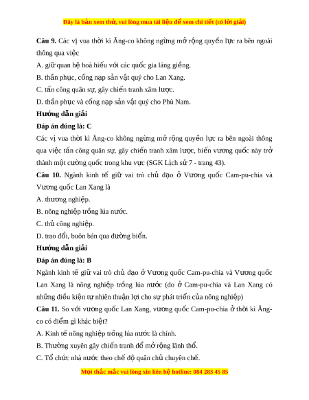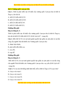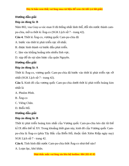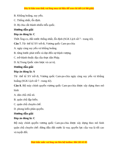 Đây là bản xem th , vu ử i lòng mua tài li u ệ đ xe ể m chi ti t (c ế ó l i ờ gi i ả ) B. Kh ng ho ủ ng, s ả uy y u. ế C. Th ng nh ố t ấ , n đ ổ nh. ị D. Bị chia c t ắ thành nhi u ề ti u ể qu c. ố Hư ng d ớ ẫn gi i ả Đáp án đúng là: C Th i ờ Ăng-co, đ t ấ nư c t ớ h ng nh ố t ấ , n đ ổ nh ( ị SGK L ch s ị 7 - ử trang 42). Câu 7. T t ừ h k ế ỉ XV tr đi ở , Vư ng qu ơ c C ố am-pu-chia A. ngày càng suy y u ế và kh ng ho ủ ng. ả B. t ng b ừ ư c phát ớ tri n và đ ể t ạ đ n s ế t ự h nh v ị ư ng. ợ C. tr t ở hành thu c ộ đ a c ị a t ủ h c ự dân Pháp. D. bị Trung Qu c xâm ố lư c và cai ợ tr . ị Hư ng d ớ ẫn gi i ả Đáp án đúng là: A
