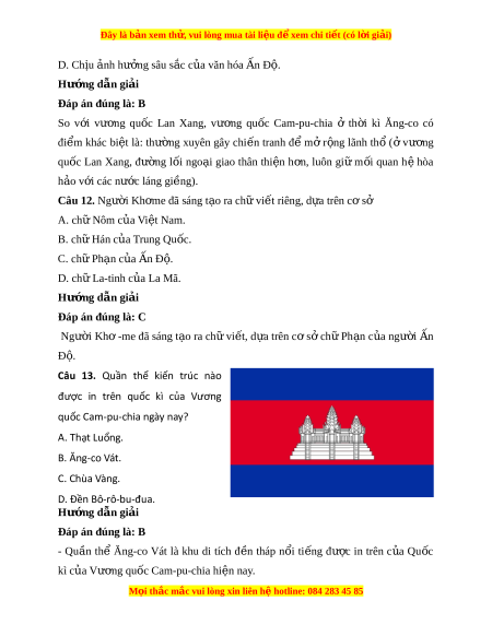 Đây là bản xem th , vu ử i lòng mua tài li u ệ đ xe ể m chi ti t (c ế ó l i ờ gi i ả ) Bài 8. Vư ng qu ơ c cam ố -pu-chia Câu 1. Th i ờ kì phát tri n ể r c ự rỡ nh t ấ c a ủ vư ng ơ qu c ố Cam-pu-chia là th i ờ kì Ăng-co, kéo dài t ừ A. th k ế ỉ IX đ n t ế h k ế X ỉ V. B. th k ế I ỉ X đ n t ế h k ế X ỉ IV. C. th k ế X ỉ đ n t ế h k ế X ỉ V. D. th k ế ỉ VI đ n ế thế k X ỉ . Hư ng d ớ ẫn gi i ả Đáp án đúng là: A Th i ờ kì phát tri n ể r c ự rỡ nh t ấ c a ủ vư ng ơ qu c ố Cam-pu-chia là th i ờ kì Ăng-co, kéo dài t t ừ h k ế ỉ IX đ n t ế h k ế X ỉ V (SGK L ch s ị 7 - ử trang 42). Câu 2. Đ n