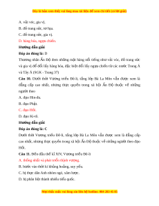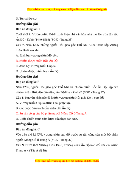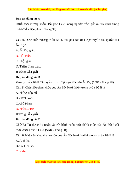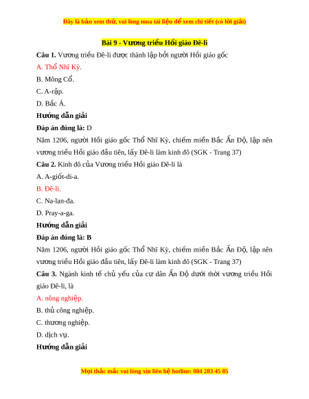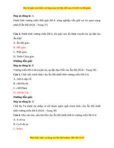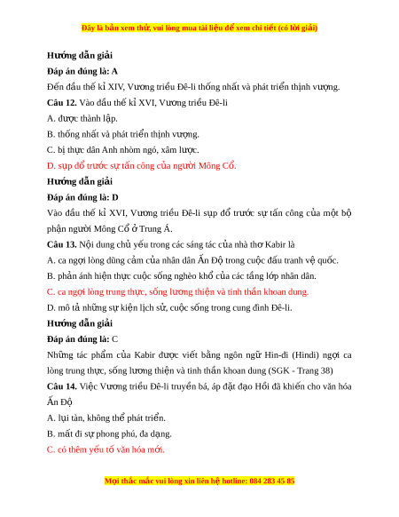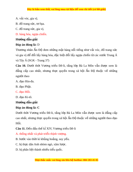Đây là bản xem th , vu ử i lòng mua tài li u ệ đ xe ể m chi ti t (c ế ó l i ờ gi i ả ) A. v i ả vóc, gia v . ị B. đồ trang s c, ứ t l ơ a. ụ C. đồ trang s c, ứ gia v . ị D. hàng hóa, ng a chi ự n. ế Hư ng d ớ ẫn gi i ả Đáp án đúng là: D Thư ng ơ nhân n Ấ Độ đem nh ng ữ m t ặ hàng n i ổ ti ng ế như v i ả vóc, đồ trang s c ứ và gia vị đ ể đ i ổ l y ấ hàng hóa, đ c ặ bi t ệ đ i ổ l y ấ ng a ự chi n ế t ừ các nư c ớ Trung Á và Tây Á (SGK - Trang 37) Câu 10. Dư i ớ th i ờ Vư ng ơ tri u ề Đê-li, t ng ầ l p ớ Bà La Môn v n ẫ đư c ợ xem là đ ng ẳ c p ấ cao nh t ấ , nh ng ư th c ự quy n ề trong xã h i ộ n Ấ Độ thu c ộ về nh ng ữ ngư i ờ theo A. đ o ạ Hin-đu. B. đ o Ph ạ t ậ . C. đ o H ạ ồi. D. đ o ạ Ki-tô. Hư ng d ớ ẫn gi i ả Đáp án đúng là: C Dư i ớ th i ờ Vư ng ơ tri u ề Đê-li, t ng ầ l p ớ Bà La Môn v n ẫ đư c ợ xem là đ ng ẳ c p ấ cao nh t ấ , nh ng ư th c ự quy n ề trong xã h i ộ n Ấ Đ t ộ hu c ộ v ề nh ng ữ ngư i ờ theo đ o ạ Hồi. Câu 11. Đ n ế đầu th k ế X ỉ IV, Vư ng ơ tri u Đ ề ê-li