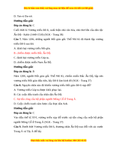 Đây là bản xem th , vu ử i lòng mua tài li u ệ đ xe ể m chi ti t (c ế ó l i ờ gi i ả ) Bài 9 - Vư ng t ơ ri u H ề i ồ giáo Đê-li Câu 1. Vư ng ơ tri u Đ ề ê-li đư c ợ thành l p b ậ i ở ngư i ờ H i ồ giáo g c ố A. Thổ Nhĩ Kỳ. B. Mông Cổ. C. A-r p. ậ D. B c Á ắ . Hư ng d ớ ẫn gi i ả Đáp án đúng là: D Năm 1206, ngư i ờ H i ồ giáo g c ố Thổ Nhĩ Kỳ, chi m ế mi n ề B c ắ n Ấ Đ , ộ l p ậ nên vư ng ơ tri u H ề i ồ giáo đ u t ầ iên, l y Đ ấ