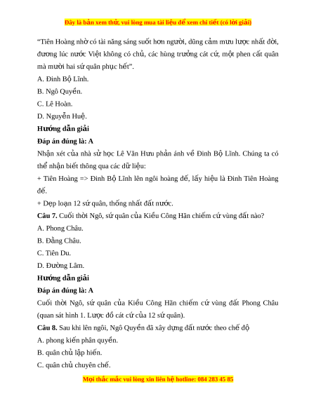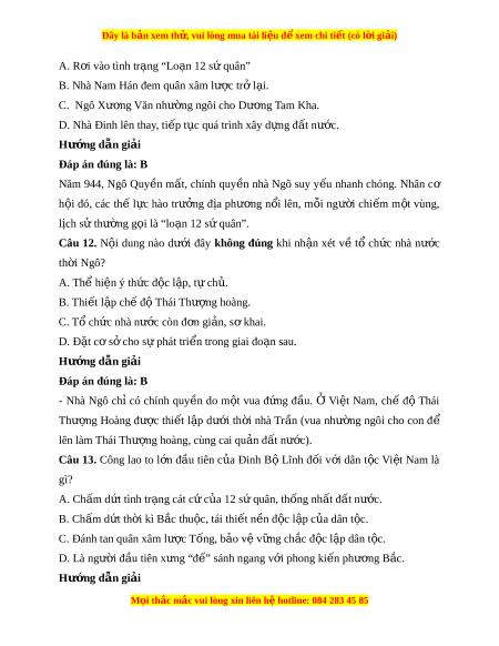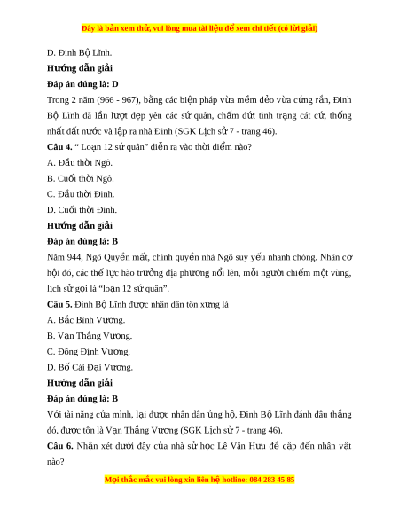 Đây là bản xem th , vu ử i lòng mua tài li u ệ đ xe ể m chi ti t (c ế ó l i ờ gi i ả ) D. Đinh B L ộ ĩnh. Hư ng d ớ ẫn gi i ả Đáp án đúng là: D Trong 2 năm (966 - 967), b ng ằ các bi n ệ pháp v a ừ m m ề d o ẻ v a ừ c ng ứ r n, ắ Đinh Bộ Lĩnh đã l n ầ lư t ợ d p ẹ yên các sứ quân, ch m ấ d t ứ tình tr ng ạ cát c , ứ th ng ố nhất đ t ấ nư c và l ớ p ậ ra nhà Đinh (SGK L ch s ị 7 - ử trang 46). Câu 4. “ Lo n 12 s ạ quân” di ứ n ễ ra vào th i ờ đi m ể nào? A. Đầu th i ờ Ngô. B. Cuối th i ờ Ngô. C. Đầu th i ờ Đinh. D. Cuối th i ờ Đinh. Hư ng d ớ ẫn gi i ả Đáp án đúng là: B Năm 944, Ngô Quy n ề m t ấ , chính quy n ề nhà Ngô suy y u ế nhanh chóng. Nhân cơ h i ộ đó, các thế l c ự hào trư ng ở đ a ị phư ng ơ n i ổ lên, m i ỗ ngư i ờ chi m ế m t ộ vùng, lịch sử g i ọ là “lo n ạ 12 s quân”. ứ